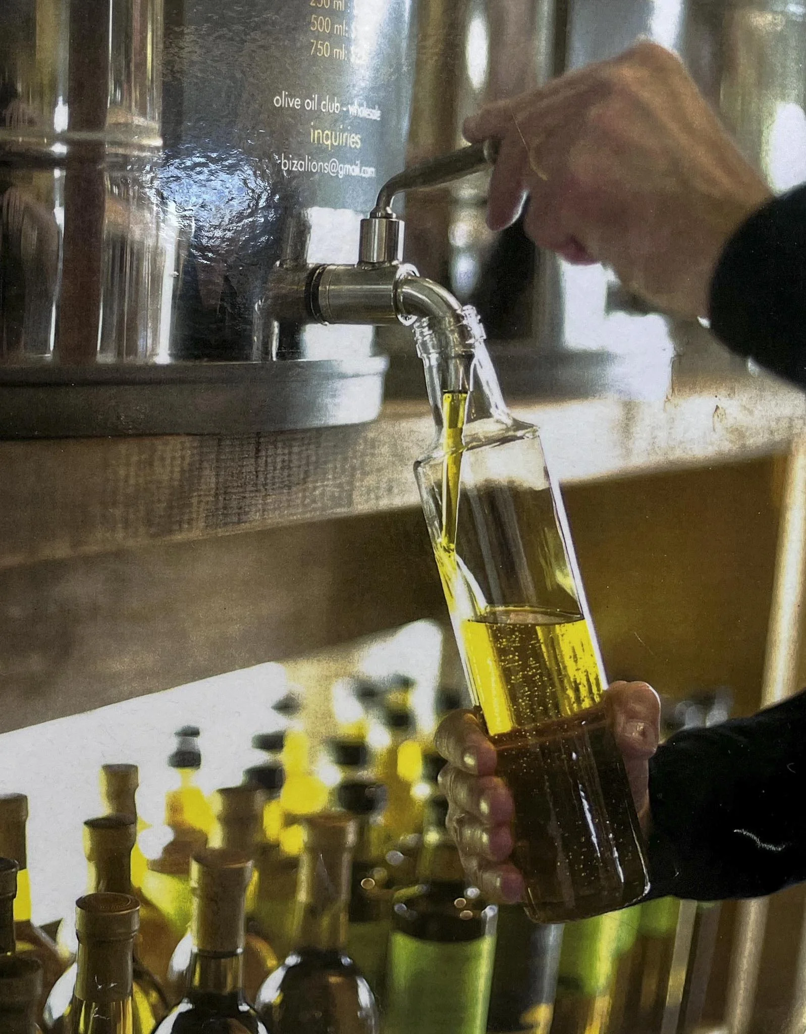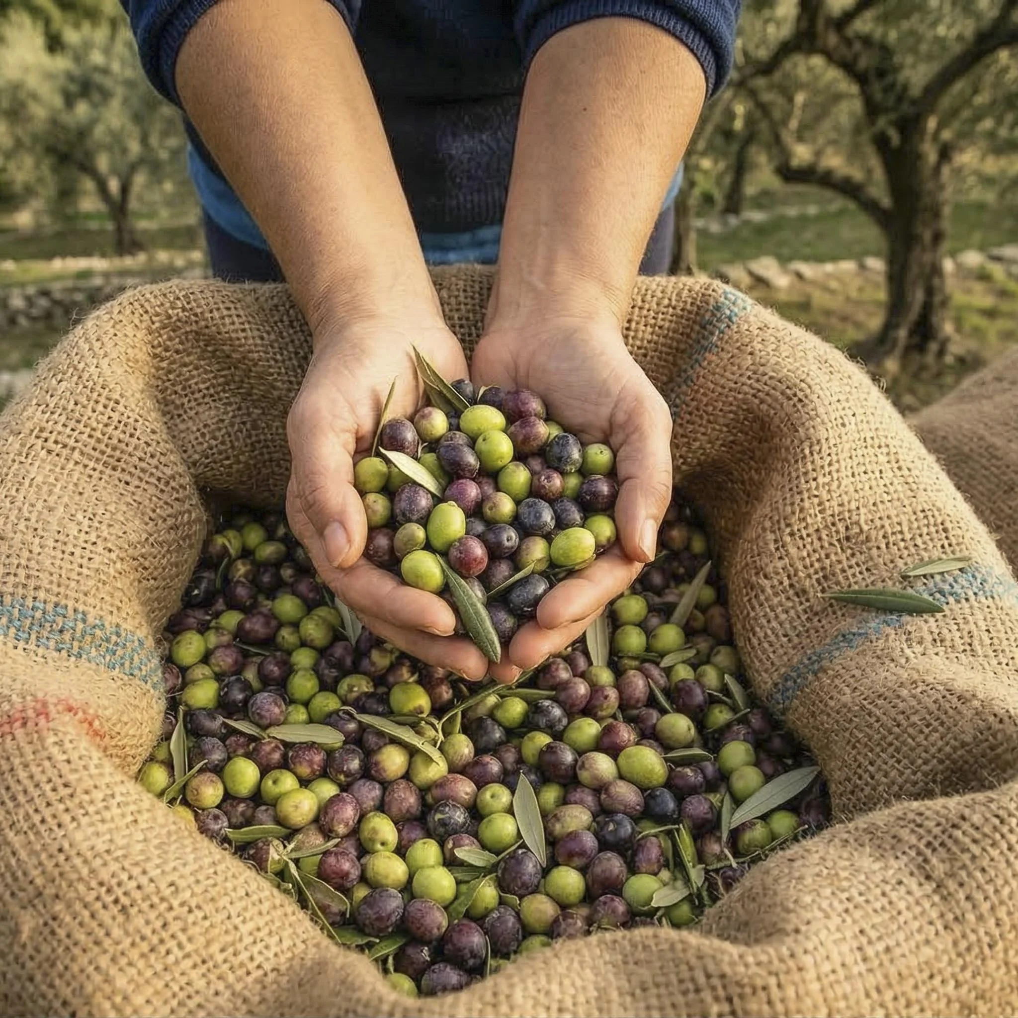 Green olives and some turning black bounce a little on falling in the net. They are shiny like polished nuggets of gold. Once the net is covered with fruit, we gather the corners like a giant sheet about to be folded and the olives form a long fat sausage trapped in its casing. We pour them gently into crates to avoid bruising.